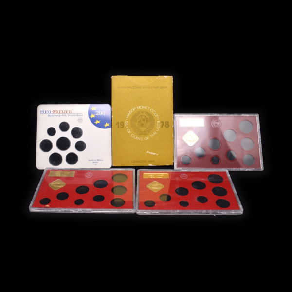 Лот пустых упаковок от годовых наборов монет СССР 1974 — 76, 1978 годов с табличками и жетонами, Германия 2005 года