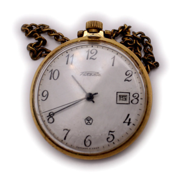 Часы карманные «Ракета». Позолота. Автоподзавод. На ходу. ⌀ 4 см. Дефекты: стекло треснуто, неисправность в работе смены календаря (СССР)