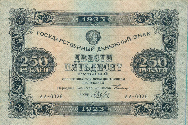 250 рублей — 1 выпуск. Нарком фин. Сокольников. Беляев 1923 - (СССР)