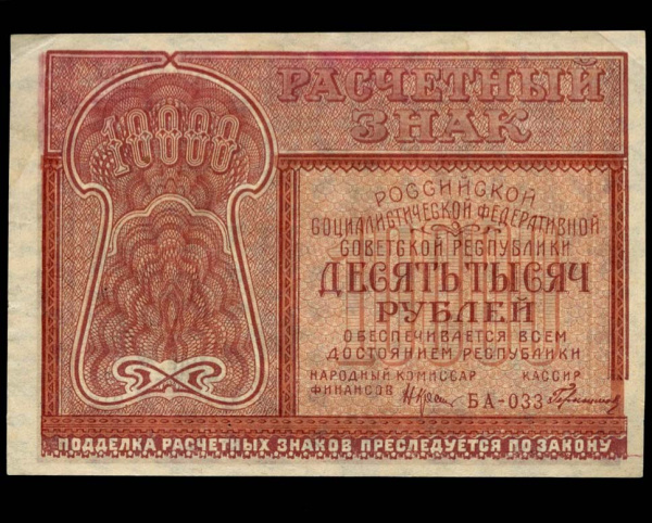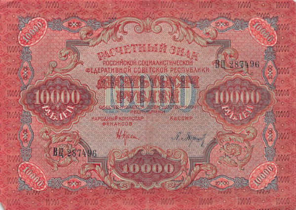 10000 рублей — Нарком фин. Крестинский. Герасимовский 1921 в/з Звезда. Без перегибов. Следы хранения на уголках (РСФСР)