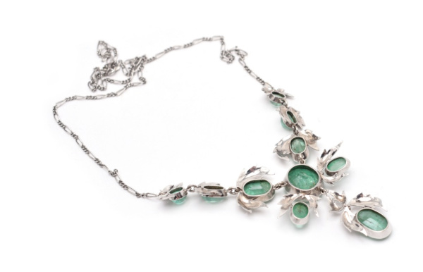 Колье. Длина 48 см. 23,53 г. Золото, изумруды 27,5 карат. Цепочка 585 пробы, растительное оформление камней 750 проба