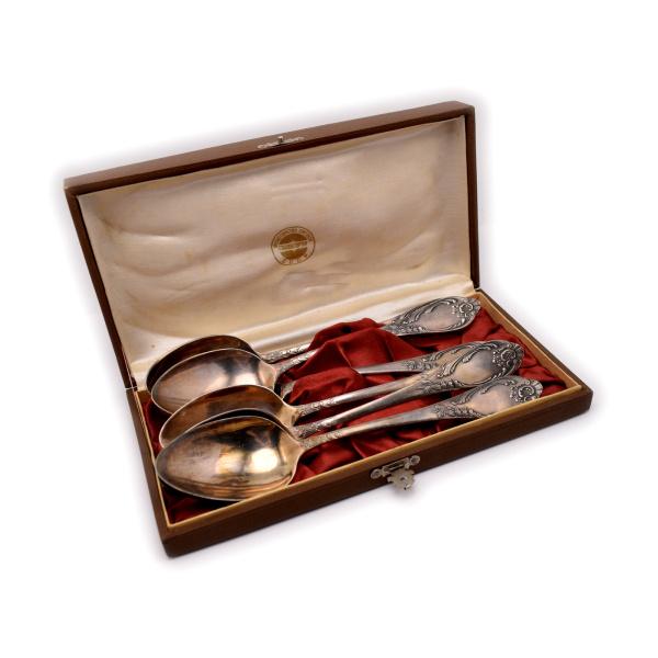Набор из 6-ти столовых ложек. Мельхиор. ЗiШ МНЦ. Длина 21 см. Главювелирторг. В коробке. Размер 24×12 см (СССР)