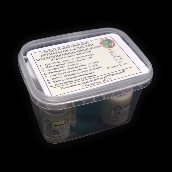 Специальный комплект препаратов для чистки коллекционных предметов из различных металлов. 8 позиций в коробке. Размер 12×9 см 2025 (Россия)