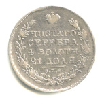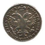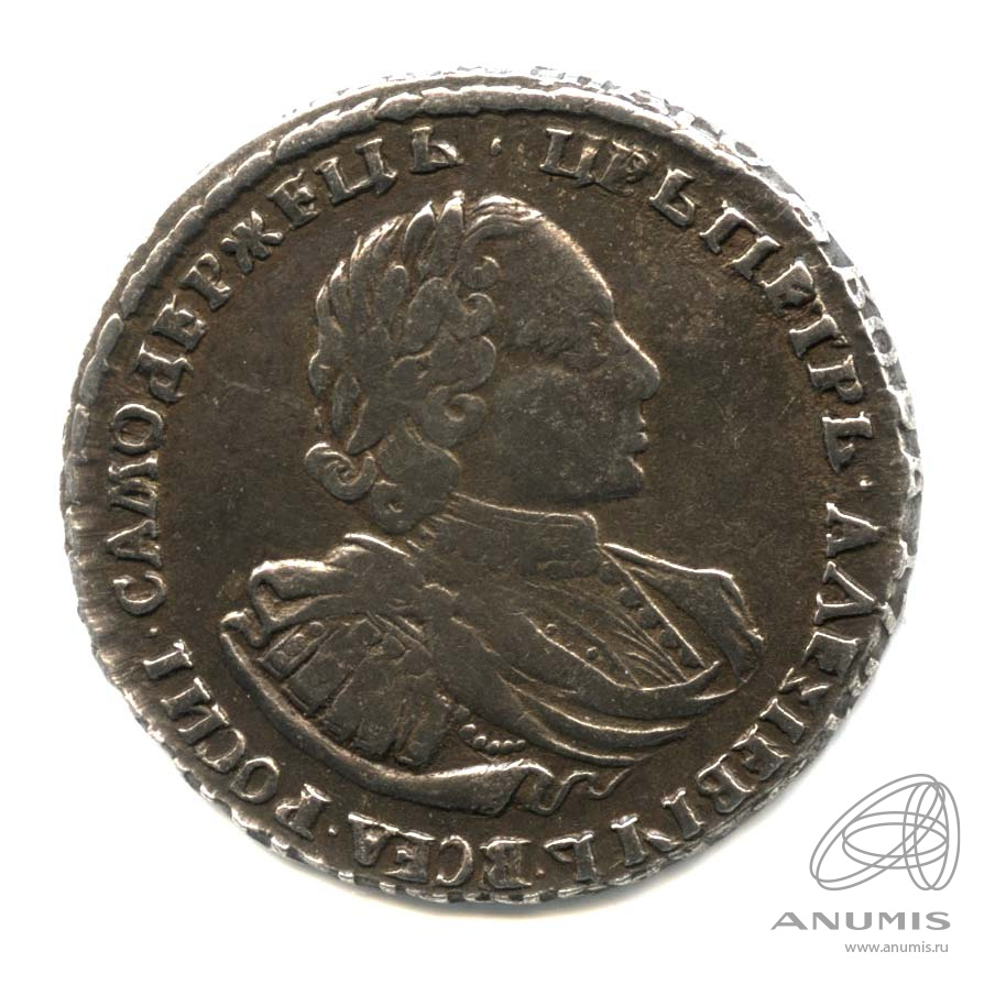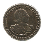 Монета регулярного выпуска: Полтина (50 копеек) 1721 года «Портрет Петра I в наплечниках. С пальмовой ветвью на груди». Полтина 1720 — 1722 гг «В наплечниках». Российская Империя: Пётр I (1682 — 1725). Серебро 728, 14 г, ø 32−34 мм, Гурт: Надпись.