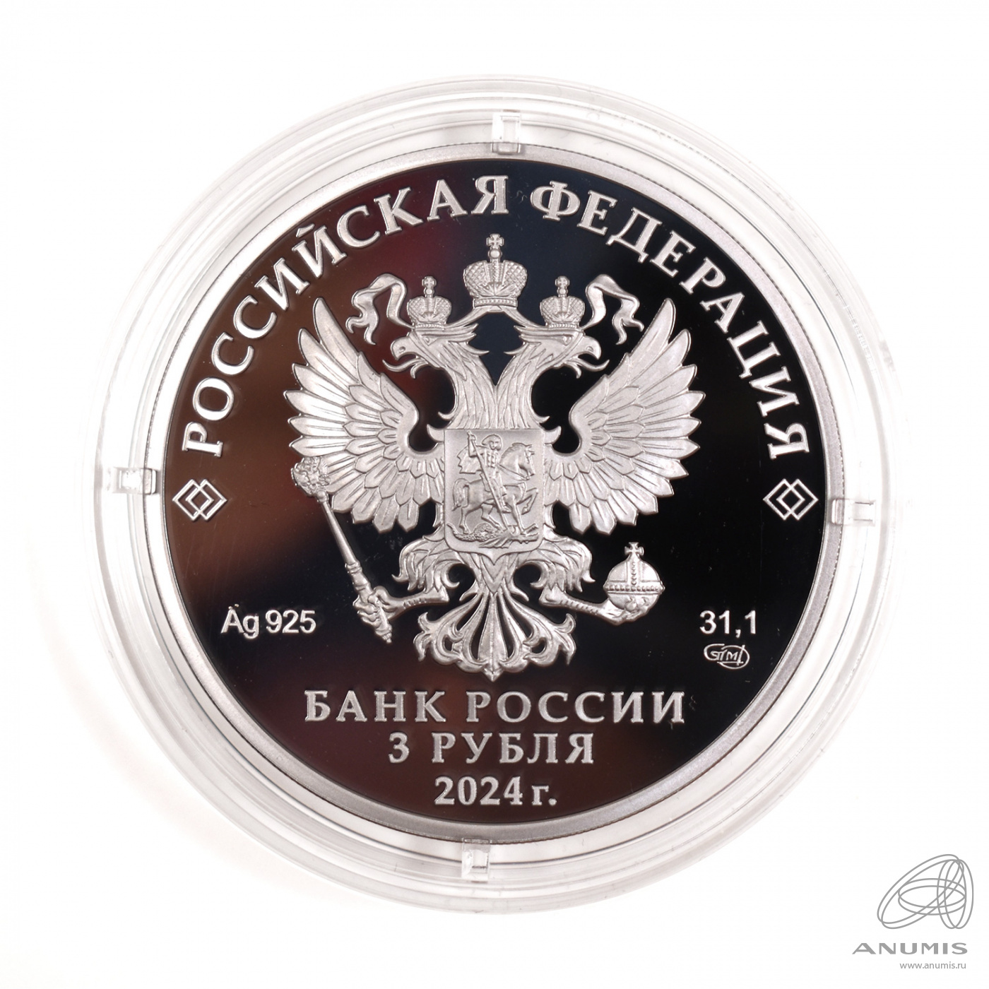 рельефное изображение Государственного герба Российской Федерации, над ним вдоль канта — надпись полукругом «РОССИЙСКАЯ ФЕДЕРАЦИЯ», обрамленная с обеих сторон сдвоенными ромбами, под гербом слева — обозначения драгоценного металла и пробы сплава, справа — содержание химически чистого металла и товарный знак монетного двора, внизу в центре в три строки — надпись «БАНК РОССИИ», номинал монеты «3 РУБЛЯ», год выпуска «2024 г.».